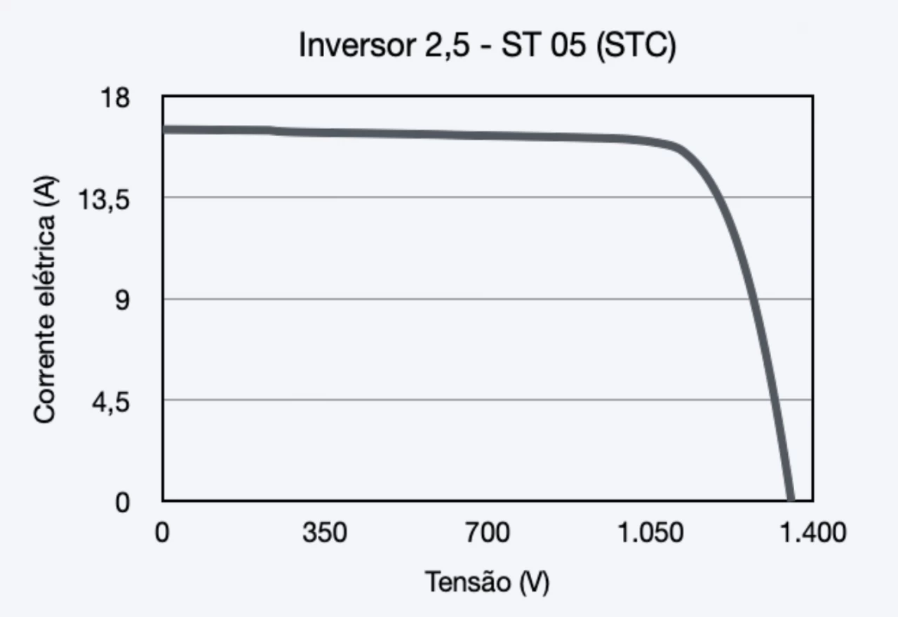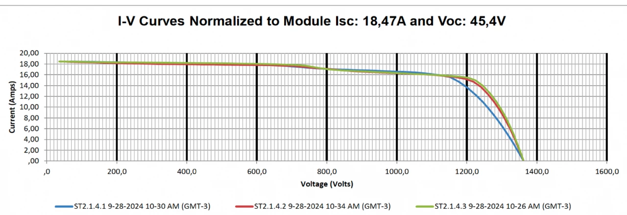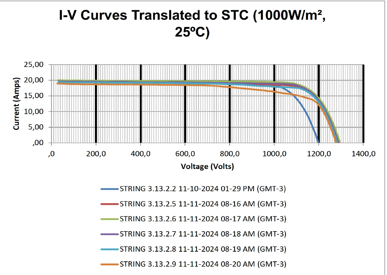 A curva traçada apresenta todos os pontos de operação transladados para as condições STC fornecidas pelo fabricante, podendo ser analisada e compara com dados de fábrica, especialmente a Voc (tensão de circuito aberto), Isc (corrente de circuito aberto) e Pm (potência máxima), e assim, determinar um fator médio de desempenho total das strings da usina