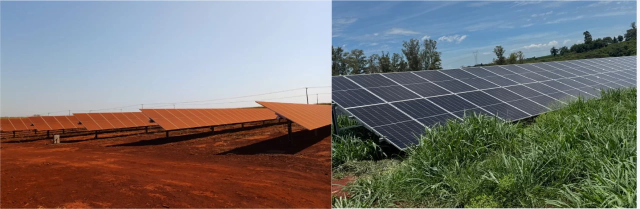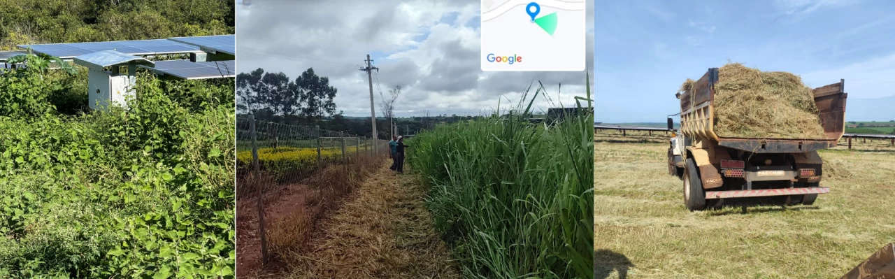 Figura 1 – Principais dificuldades lidadas em UFVs: sujidade de módulos FV e rápido crescimento de vegetação rasteira.